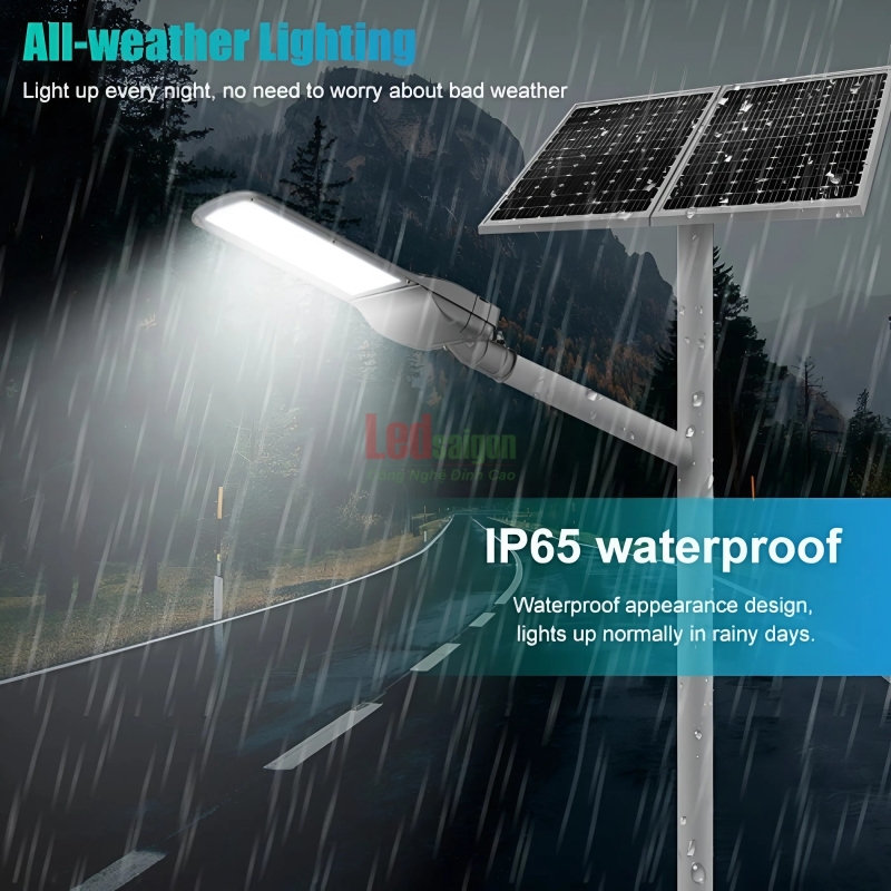 Công suất: 60W 100W 150W 200W Chip Led Led Bridgelux Ánh sáng: 3000K - 6000K Kích thước đèn: 535*210*108mm 605*265*108mm 710*265*108mm 760*280*108mm Kích thước Panel: 1020x990x30mm 1340x990x30mm 1820x990x30mm 2200x990x30mm Công suất tấm pin: 18V/120W 18V/150W 18V/120W*2 Tấm 36V/150W*2 Tấm Dung lượng Pin: 12,8V/60Ah 12,8V/90Ah 25,6V/100Ah 25,6V/120Ah Hiệu suất phát quang: 190Lm/W 190Lm/W 190Lm/W 190Lm/W Sử dụng độ cao: 6 mét -8 mét 7 mét -9 mét 8 mét -10 mét 10 mét -12 mét Khoảng cách lắp đặt: 25 mét -30 mét 25 mét -30 mét 25 mét -30 mét 25 mét -30 mét Thời gian sạc: 4-6 giờ 4-6 giờ 4-6 giờ 4-6 giờ Thời gian chiếu sáng: 2-3 ngày mưa 2-3 ngày mưa 2-3 ngày mưa 2-3 ngày mưa Tiêu chuẩn chống nước: IP65 IP65 IP65 IP65 Bảo hành: 3 năm 3 năm 3 năm 3 năm -