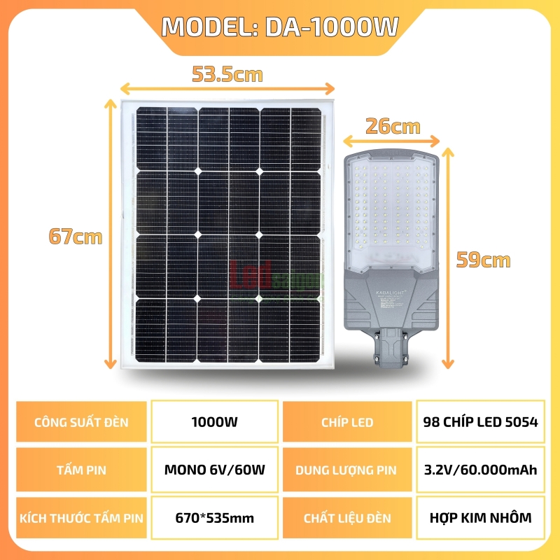 Công suất: 1000W Ánh sáng: Trắng Mã sản phẩm: DA-1000W Chíp Led: 98 Led 5054 siêu sáng Kích thước đèn: 590 * 260 * 850 mm Kích thước tấm pin: 670 * 535 * 20 mm Dung lượng pin: 3.2V / 60.000mAh Công suất tấm pin: Mono 6V / 60W Thời gian sạc: 4 giờ – 6 giờ. Thời gian chiếu sáng: 12 giờ Diện tích chiếu sáng: 150 - 250 mét vuông Quang thông 150 Lumen/W. Tiêu chuẩn chống nước: IP66 Chứng nhận: CO,CQ, ISO 9001:2015 Bảo hành: 3 năm -