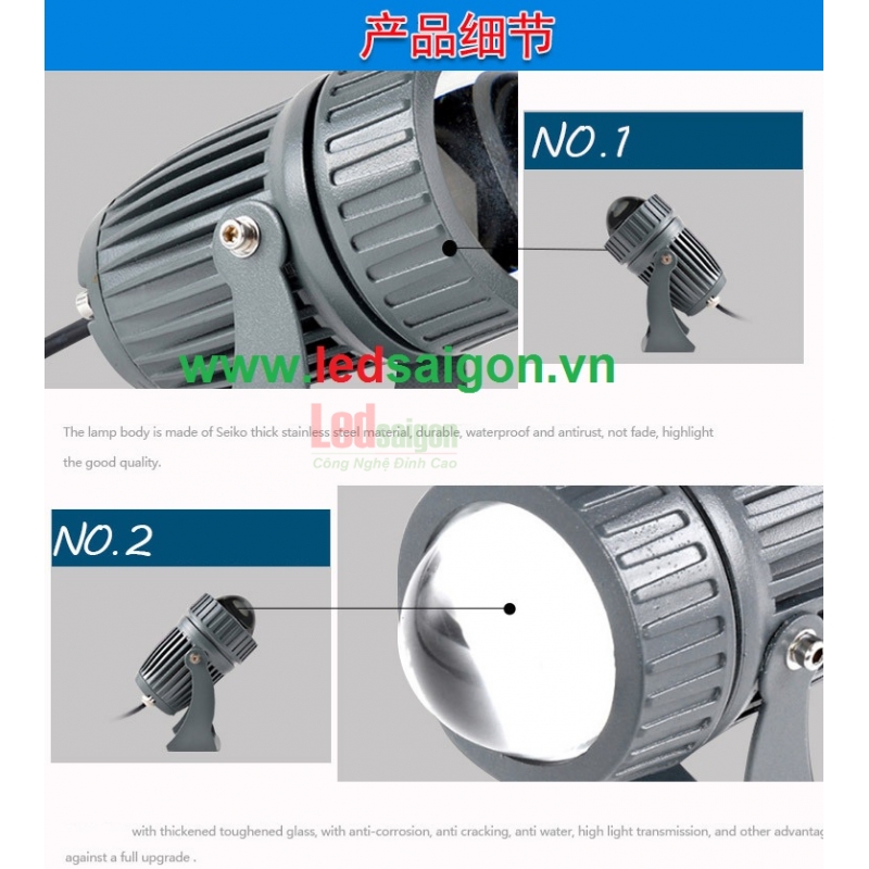 Đèn led rọi 10W dùng chất liệu thân nhôm đúc, kính gia nhiệt. Dùng chips LED Epitar, Bridgelux, Cree, ..