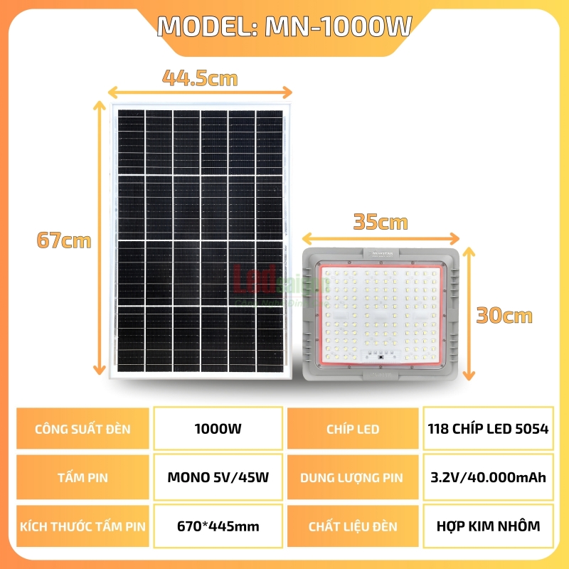 Đèn Pha LED Năng Lượng Mặt Trời LSG-MN1000 là giải pháp chiếu sáng diện tích lớn với hệ thống 118 Chip Led 5054 thế hệ mới. Sản phẩm tích hợp viên pin dung lượng khủng 40000mAh, cho phép thắp sáng liên tục 12 - 14 giờ mỗi đêm. Với tấm pin Mono 45W sạc siêu nhanh, đèn vận hành bền bỉ ngay cả trong điều kiện thiếu nắng.